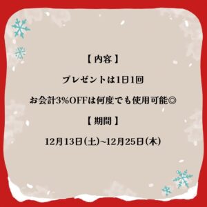 お会計3%OFFは期間中何度でもご利用いただけます!